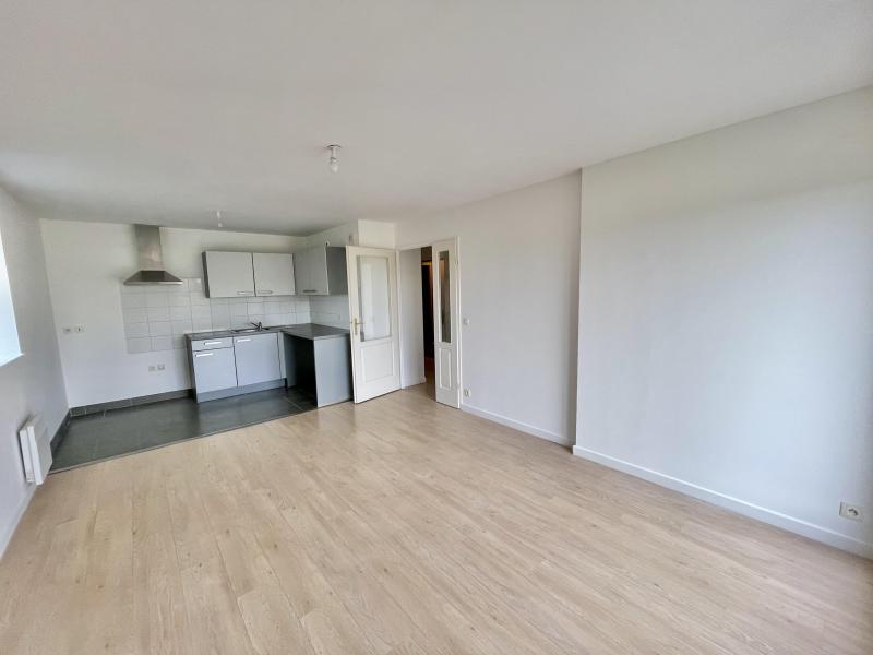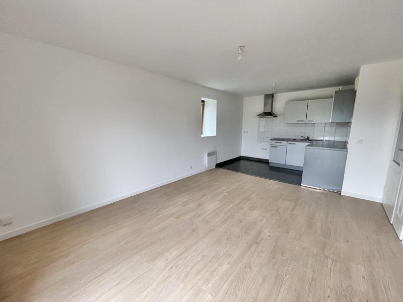 • Séjour lumineux en parquet avec cuisine ouverte meublée.