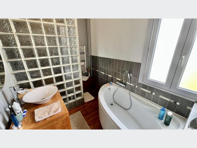 Une salle de bain complète (douche, baignoire, sèche-serviettes) ainsi qu’un cellier viennent parfaire l’ensemble.